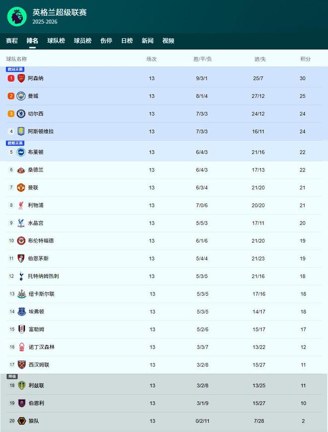 - 2025-12-05一日英超动向:曼联利物浦难兄难弟,阿森纳领跑态势不可阻挡