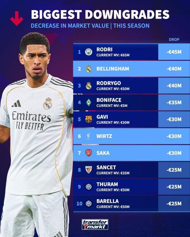 本赛季,德转盘点了球员身价下滑榜,其中罗德里下滑4500万欧元,贝林、罗德里戈下滑4000万欧元。